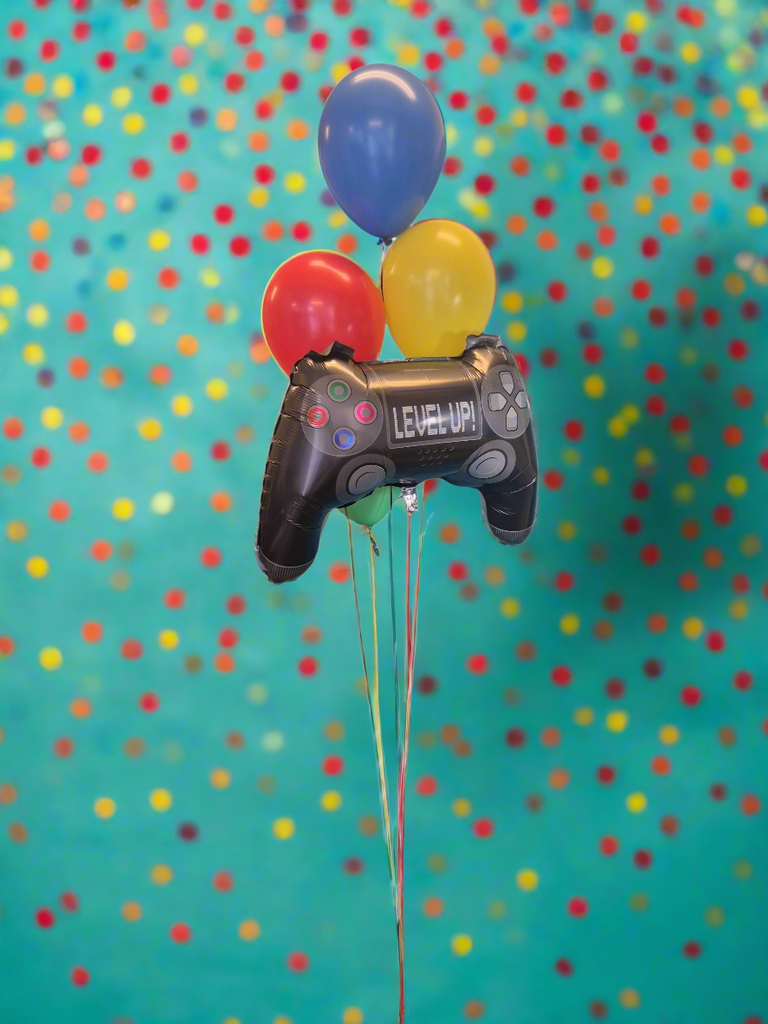 För den spelintresserade är denna bukett perfekt. Fyra latexballonger i glada färger, en stor spelkontroll och en mindre folieballong med texten "happy birthday, you've leveled up!"