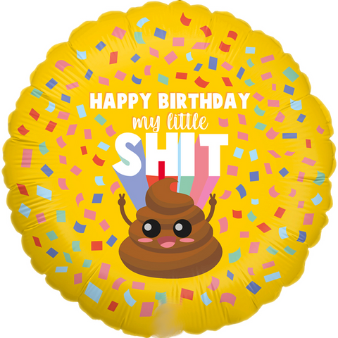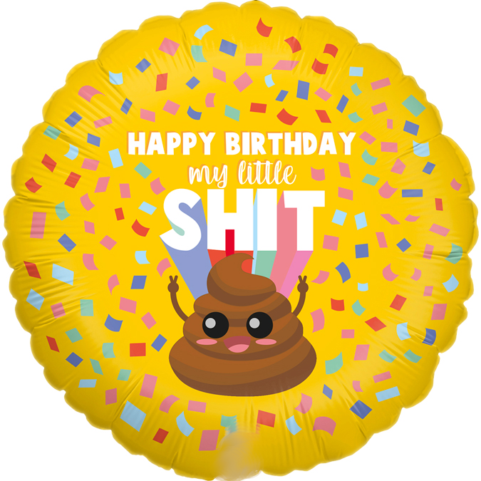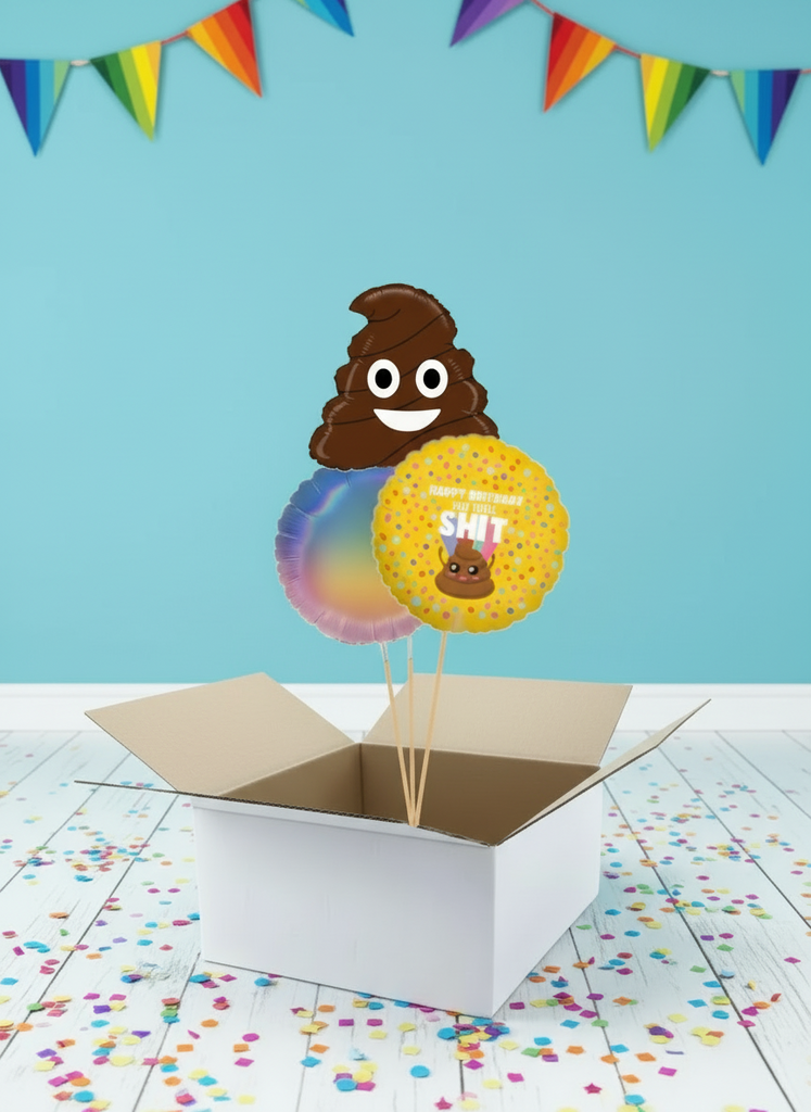 I den här humorvarianten så består buketten av en poop emoji-ballong, en rund regnbågsballong och en gul ballong med tryck av ytterligare en poop-figur samt texten "happy birthday my little shit". Kanske från storasyster när lillebror fyller 30? "don efter person" som det heter !