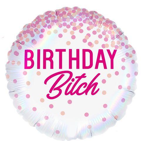I den här humorvarianten så består buketten av en rund ballong med konfettitryck i rosa samt texten "Birthday Bitch", en rosa hjärtballong och en rund silverballong.