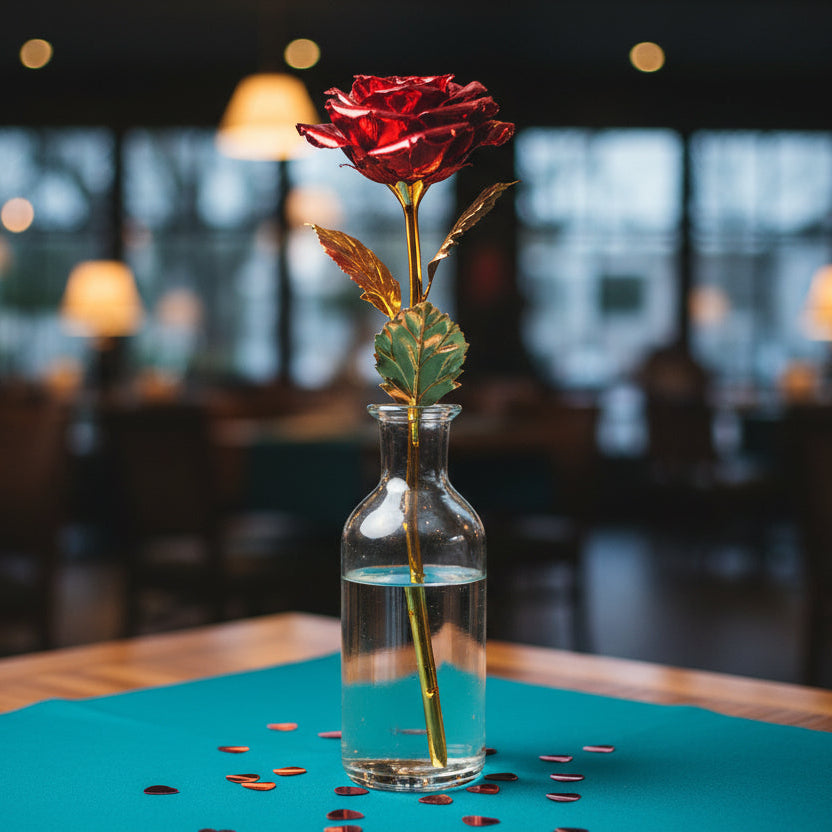 En ros som aldrig dör! Kronblad gjorda av glansig röd metallfolie.