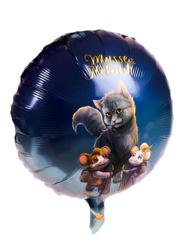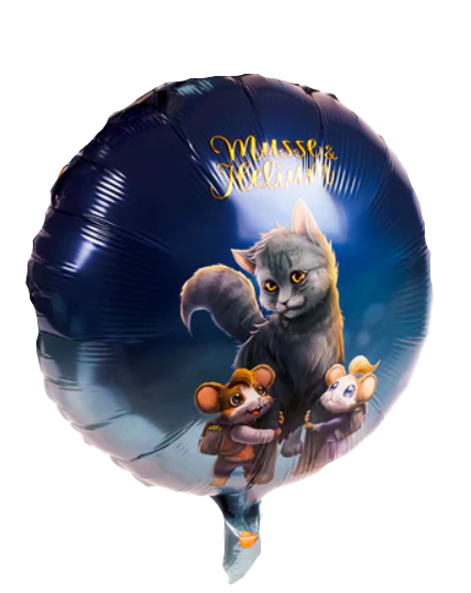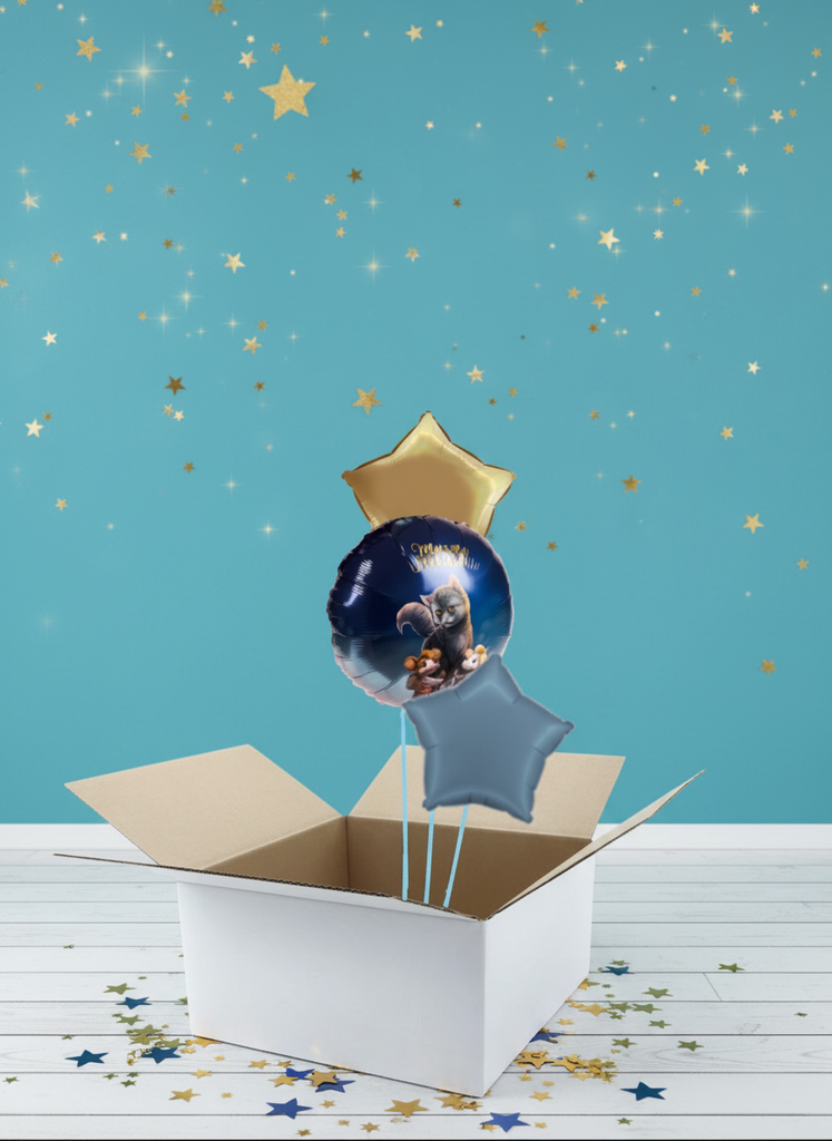 I den här varianten så består buketten av en rund ballong med Musse&helium från de populära barnböckerna, en gråblå och en guldfärgad stjärnballong.